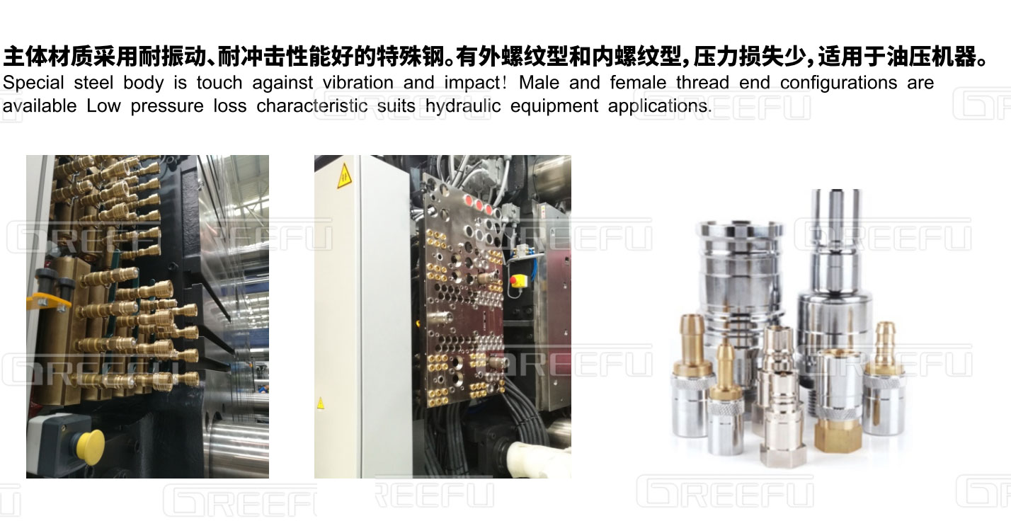 單路快插連接系統:主體材質采用耐振動、耐沖擊性能好的特殊鋼。有外螺紋型和內螺紋型,壓力損失少,適應于油壓機。